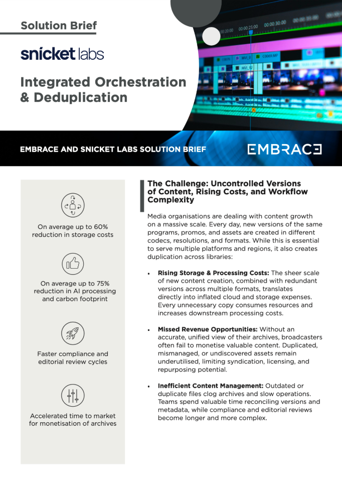 Since 2015, Embrace has been transforming content creation at scale by connecting people, systems and processes. The company develops advanced automation, orchestration and collaboration solutions for the Media & Entertainment industry and global brands. Embrace aims to unleash creativity and improve performance around video and graphics supply chains.