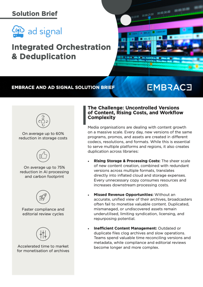 Since 2015, Embrace has been transforming content creation at scale by connecting people, systems and processes. The company develops advanced automation, orchestration and collaboration solutions for the Media & Entertainment industry and global brands. Embrace aims to unleash creativity and improve performance around video and graphics supply chains.